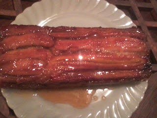 COLOQUE AS TIRAS DE BANANA NO FUNDO DA FORMA JÁ CARAMELIZADA .